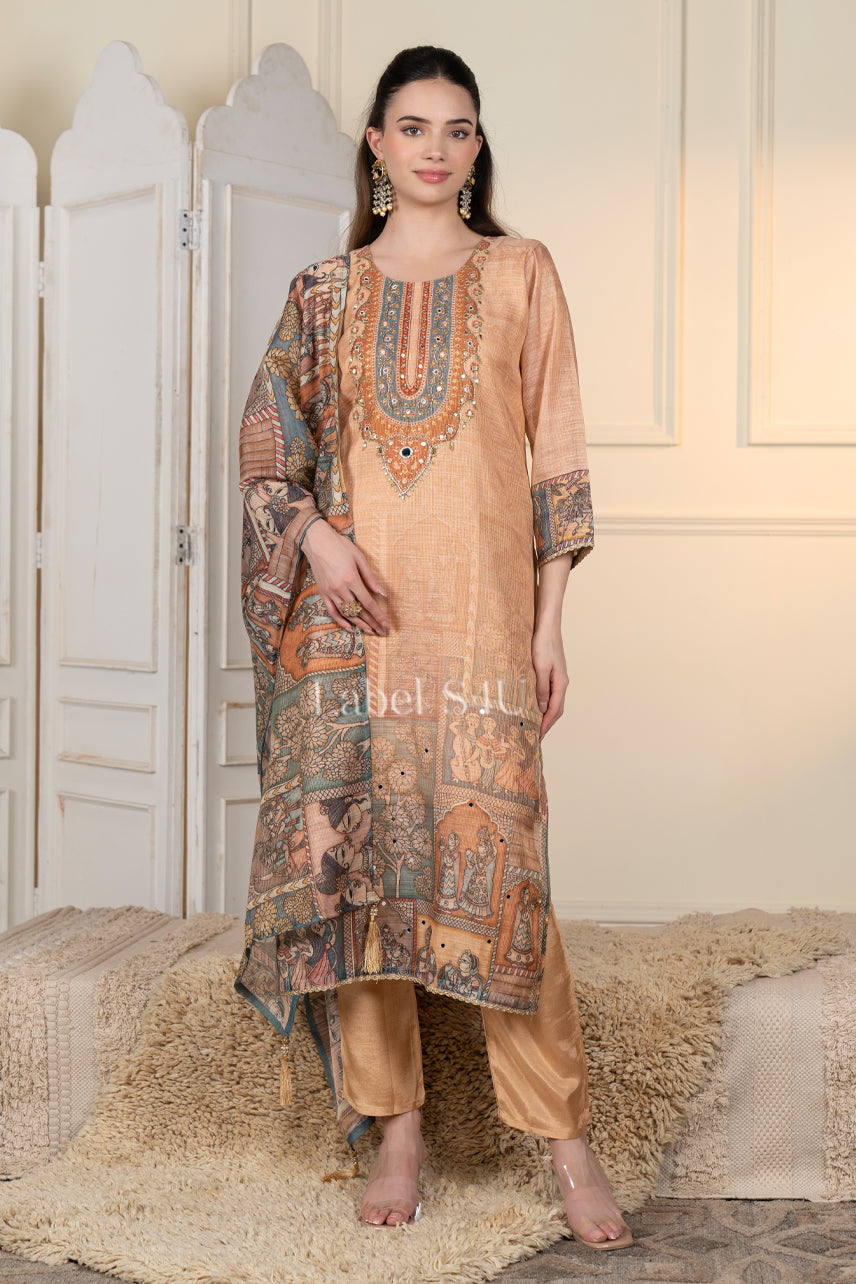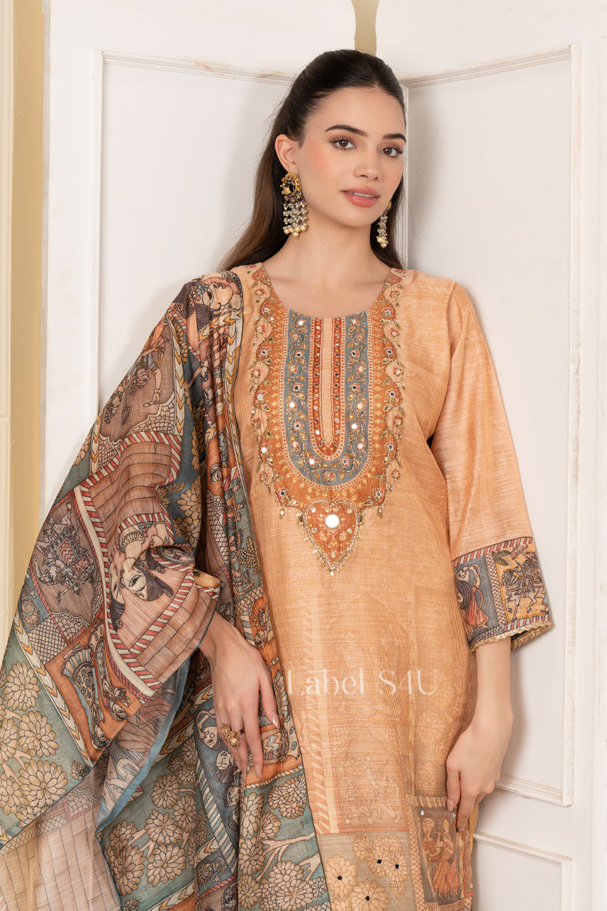 Warm and artistic, this printed suit set features a straight silhouette, intricate ethnic-inspired motifs, and detailed neckline embroidery. Paired with matching straight pants and a coordinated printed dupatta, this ethnic festive outfit blends traditional charm with everyday elegance. Crafted in lightweight fabric with a soft fall, it offers comfort with statement appeal.