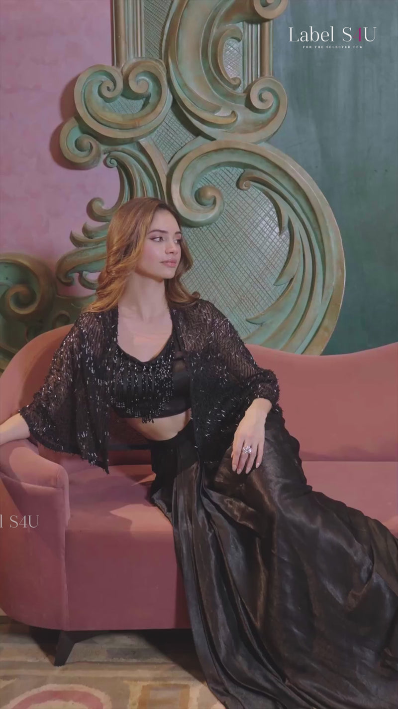 A stunning black set that features a cape-style top with delicate beadwork, offering a sophisticated yet modern look. The crop top has tassel work, adding a hint of glamour and contemporary style, while the flowing black drape skirt completes the set with a graceful silhouette. This outfit is perfect for evening events or special occasions where you want to make a refined fashion statement.