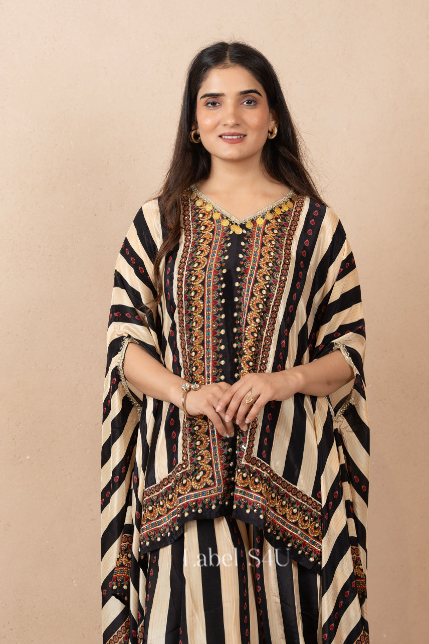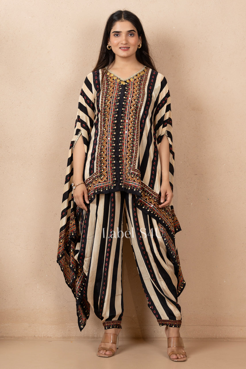 Make a bold style statement with our Boho Mirage Kaftan Co-ord Set, a perfect blend of comfort and contemporary charm. Crafted in soft, breathable fabric, this co-ord features a flowy kaftan-style top paired with dhoti pants in striking black and cream stripes with intricate ethnic borders. Whether you’re heading for brunch, a family gathering, this kaftan co-ord ensures all-day comfort with a high-fashion edge.