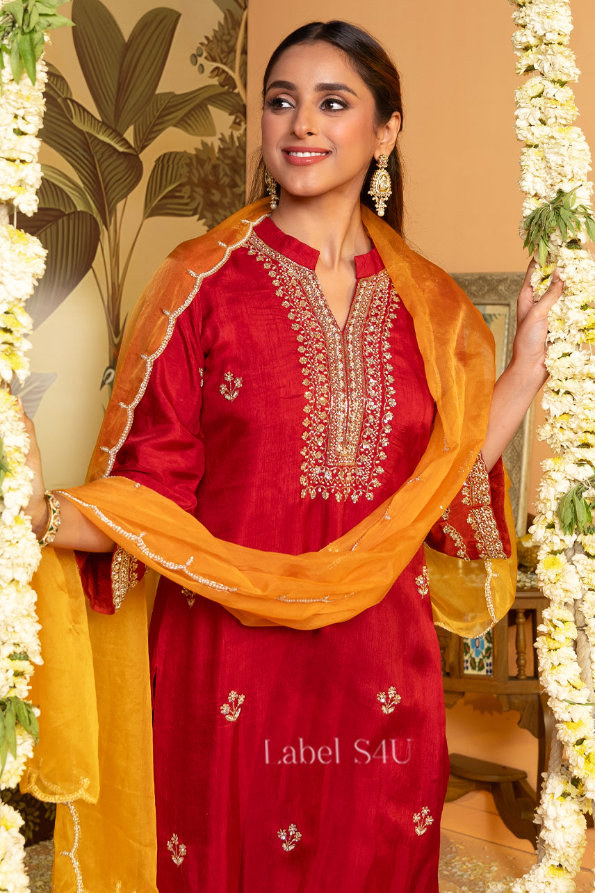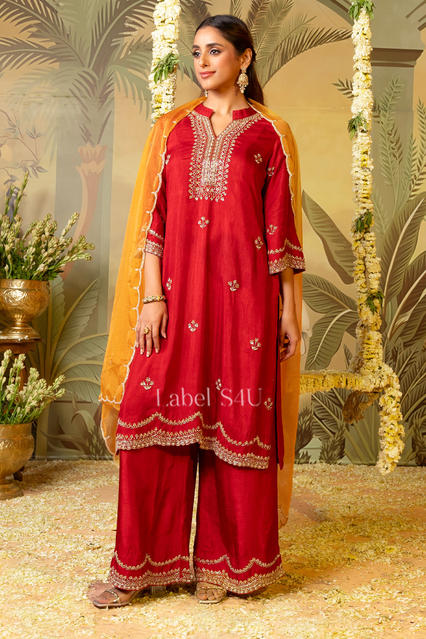 This elegant kurta set for women features a straight-fit kurta crafted in a rich red hue, beautifully adorned with intricate handwork along the neckline, sleeves, and hemline. Delicate handwork motifs scattered across the kurta add a refined festive charm, while the ornate borders lend a regal finish to the overall look. The kurta is paired with coordinated palazzo pants featuring embroidered detailing at the hem, offering a comfortable yet graceful silhouette. Completing the look is a contrast dupatta in a warm golden-mustard tone, adding a vibrant pop of color and enhancing the festive appeal. Crafted from premium-quality, lightweight fabric, this set ensures breathability and ease of movement, making it ideal for long celebrations.