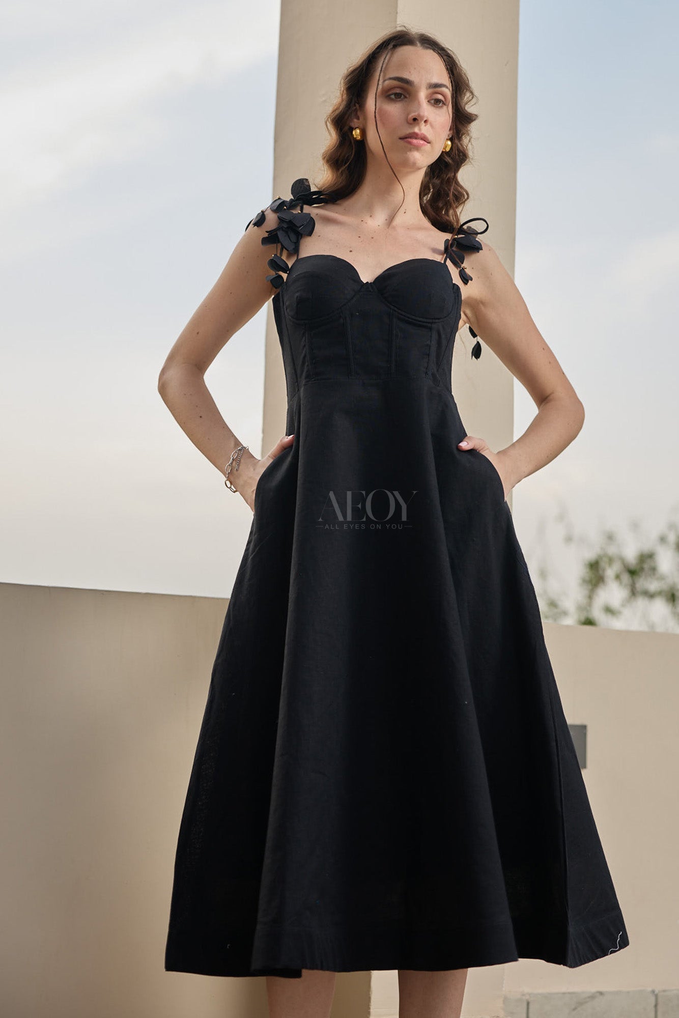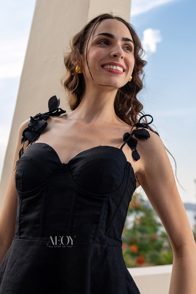 • Bustier-style bodice with tie-on floral detail shoulder straps