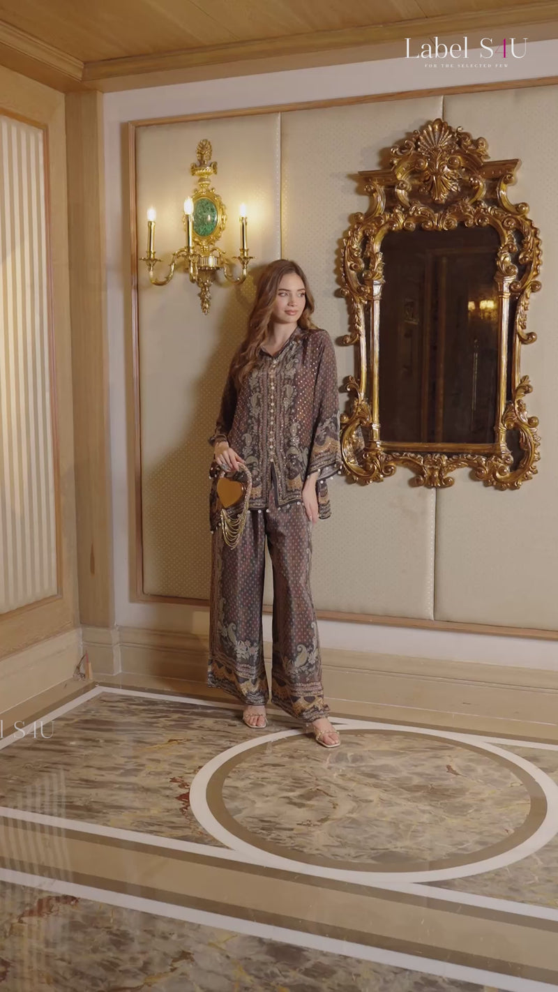 Upgrade your everyday style with this brown printed co-ord set, which offers a perfect blend of comfort and elegance. This stylish set includes a printed top and matching pants, designed with beautiful baroque-inspired motifs and delicate lace detailing on the sleeves and hemline. Made from soft, breathable fabric, this outfit is perfect for long hours, making it ideal for office wear, casual outings, lunch dates, festive gatherings, and small gatherings. The relaxed fit gives a comfortable look, while the rich brown tones add a classy and timeless vibe.
