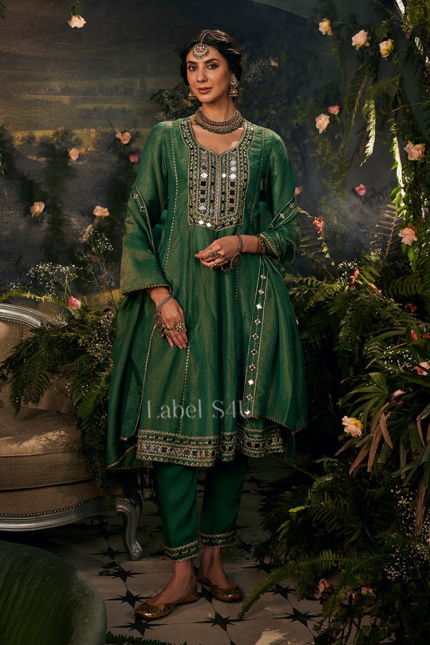 This mirrorwork green Anarkali set is designed for women who love rich festive elegance with graceful movement. Featuring a flowy Anarkali silhouette with intricate mirror and embroided detailing on the yoke, it is paired with fitted bottoms and a matching dupatta for a complete ethnic look. Crafted in a shimmery, lightweight fabric with a soft festive sheen, it feels comfortable while looking luxuriously dressed-up. Perfect for Eid celebrations, weddings, festive evenings, and family functions, this set stands out for its timeless colour, flattering flare, and effortless styling—best worn with statement jewellery and ethnic heels for a polished festive look.